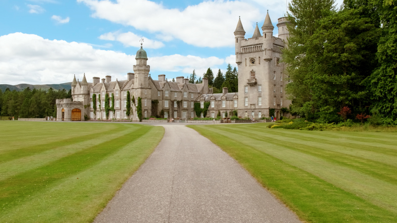 Cinematic view of Balmoral Castle, a large residence in Royal Deeside, Scotland, UK, developed by Queen Victoria in 1856